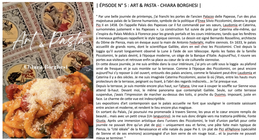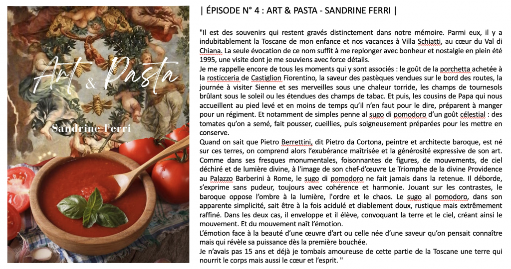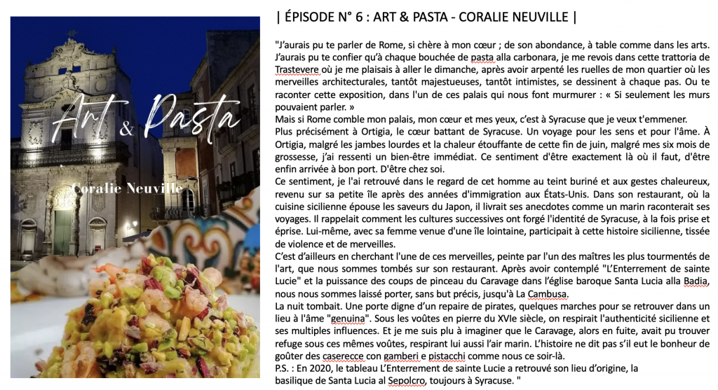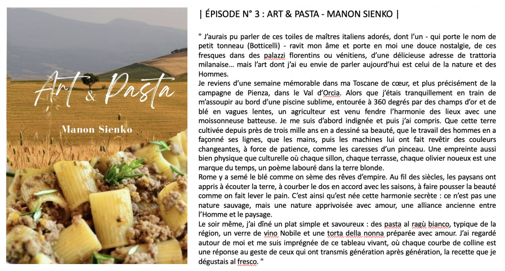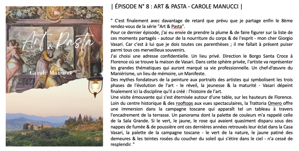 Pour mettre à l’honneur ces parenthèses & pour les faire rayonner, j’ai eu envie d’inviter sur mon compte des femmes qui partagent avec moi cet amour de l’Italie, de l’Art, du Beau, du Bon & de leur demander quel était leur plus beau souvenir « Art & Pasta». Un lundi sur deux, j’ai donc laissé la plume à une invitée afin qu’elle partage un souvenir où l’art se mêle & se mélange à l’art de vivre.